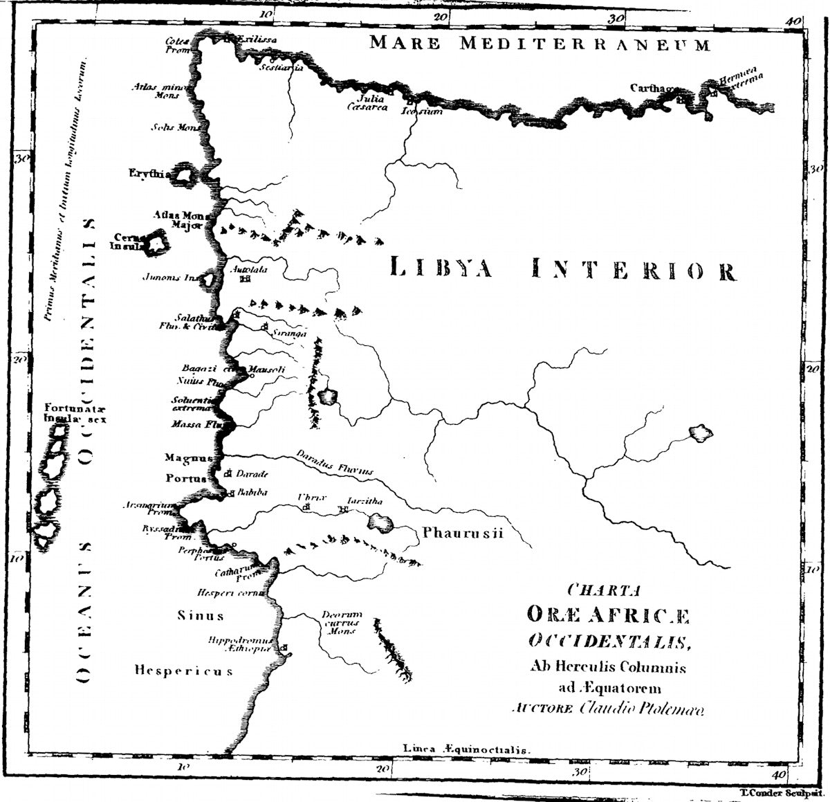 The map is titled "CHARTA ORE AFRICE OCCIDENTALIS, Ab Herculis Columnis ad. Equatorem AUCTORE Claudio Ptolemæo", which translates to "Map of the West African Coast, from the Pillars of Hercules to the Equator, by the Author Claudius Ptolemy".