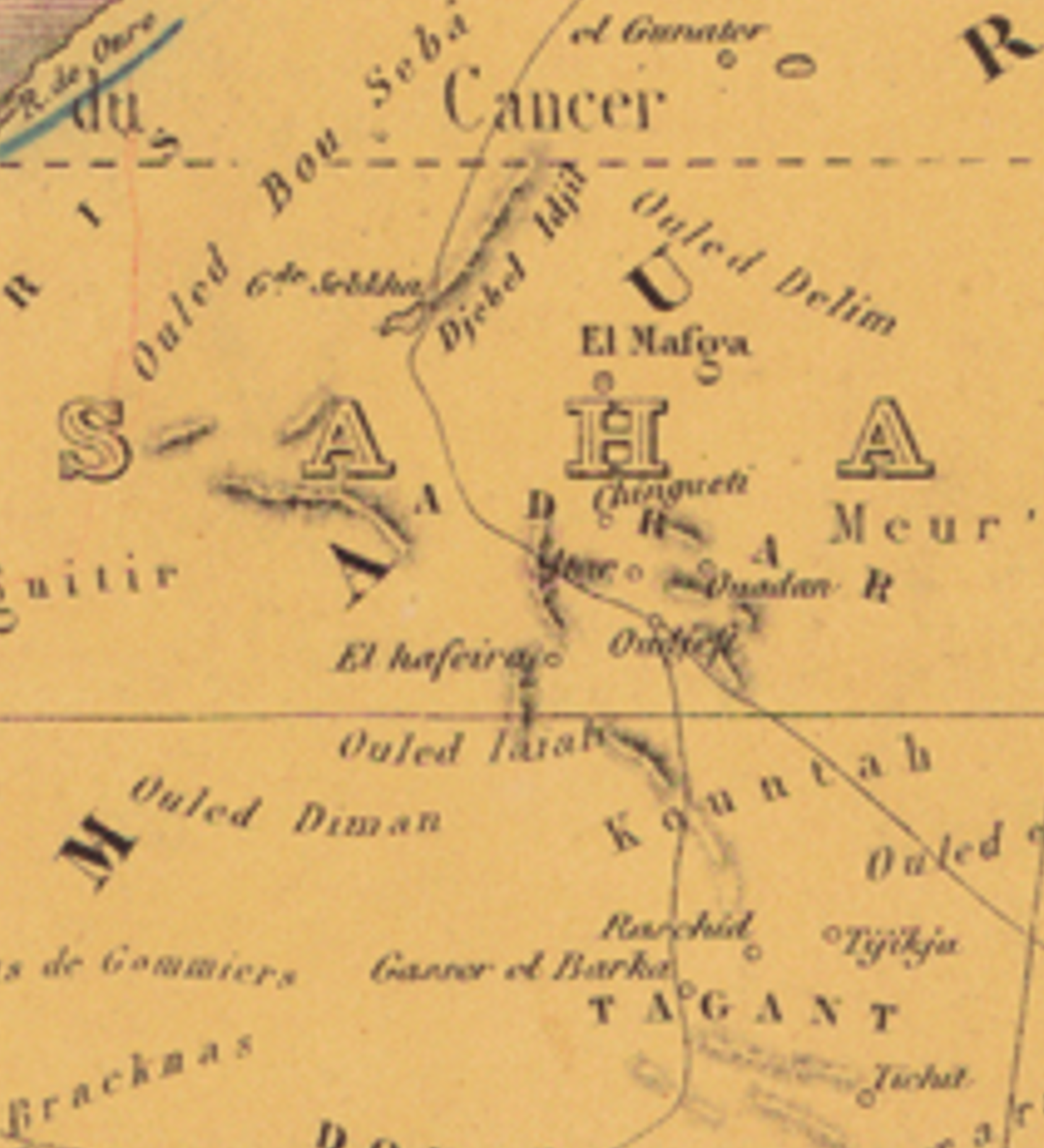 The river gets lost in the sands north of the western foothills of the Adrar Plateau.